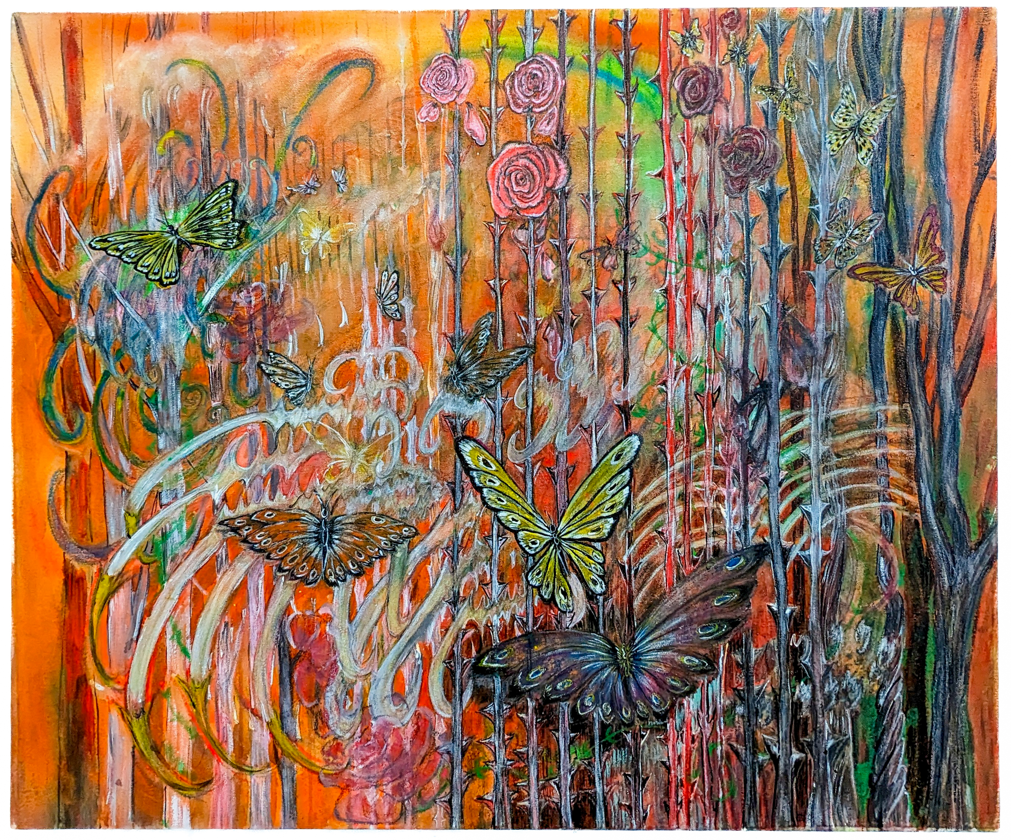 Acrylic paint; chalk pastel; colored pencil on canvas
